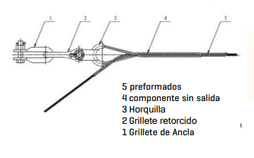 Conjunto Retención ADSS 5 preformados 4 componente sin salida 3 Horquilla 2 Grillete retorcido 1 Grillete de Ancla Las hebillas de este tipo de remate permiten una fijación rápida y simple de cable ADSS de 8 a 20 mm de diámetro sobre vanos de 600 m como máximo.