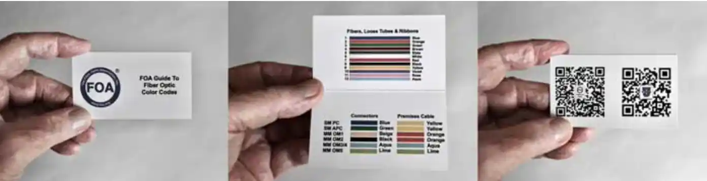 FOA ha creado una guía de bolsillo para códigos de color de fibra óptica que envió a CFOT nuevos y renovados. Tiene códigos de color para fibras y tubos amortiguadores, conectores y cables de locales dentro y en la parte posterior, códigos QR para llevarte directamente a la Guía FOA y Fiber U.